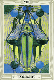 Crowley’s justice card is steely grey in colour, highlighting the element of air. Ruler of the sign of Libra and corresponding to our thoughts. The geometry of the scales is the most prominent feature. Like most cards in the Thoth deck, it has a beautiful layout of sacred geometry. One must look into the scales to see Justice standing blindfolded holding a sword. The card has also been renamed “adjustments”