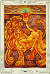 In contrast, the Thoth Tarot has the card re-named “Lust” and depicts a woman riding a lion. She is underneath the earth and reaching up through the crust of Gaia to the sky, drawing down power and creating life. This picture of feminine power goes beyond traditional decks and glorifies feminine passion and creation. Many contemporary decks hint at Crowley’s idea of changing the lion in the card to a panther or other large cat associated with feminine beauty power and sexuality.